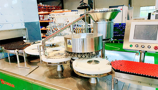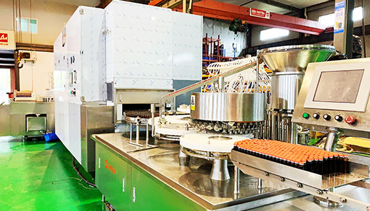 采用超聲波清洗及水氣交替沖洗、熱風(fēng)循環(huán)式高溫滅菌、多頭灌裝與封口等技術(shù)。整線聯(lián)動自動控制。操作簡單方便,實(shí)現(xiàn)了機(jī)電一體化。